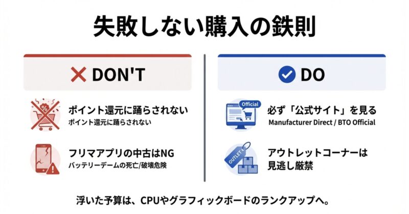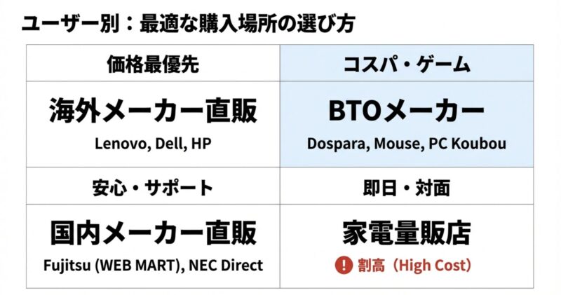 私が初心者の方から「安くて安心できる場所はどこ?」と相談されたとき、まずおすすめするのは「メーカー直販サイト(Web)」か「BTOメーカーの公式サイト」です。