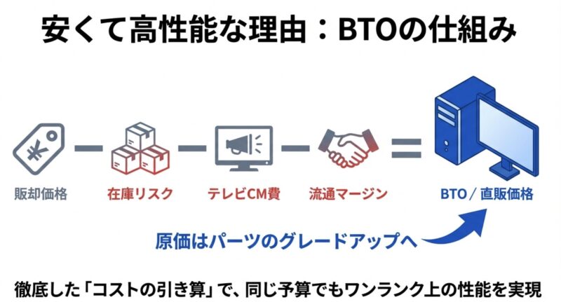 つまり、「パソコンの性能そのもの(CPUやメモリの原価)」にお金を払い、ブランド料や安心料といった見えないコストを払わなくて済むのがBTOの最大の魅力です。