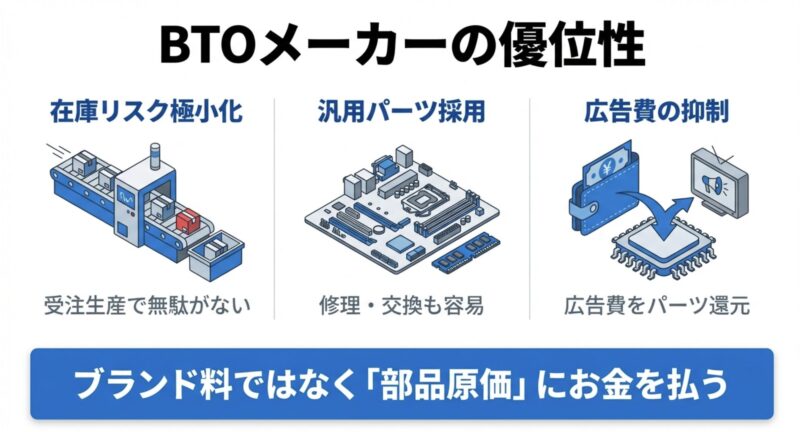 - 中間マージンを徹底的にカット:BTOならではの構造的な安さがある。