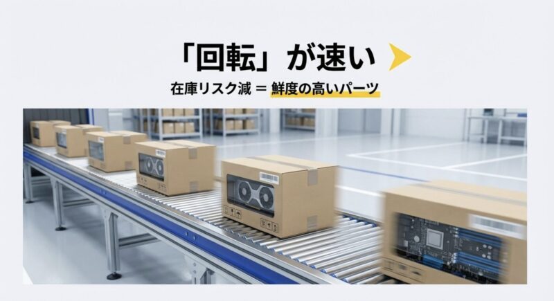 つまり、在庫を抱えるのは怖い。けど回転が速いと、抱える期間が短くなって“古くなる”前に売り切りやすいです。