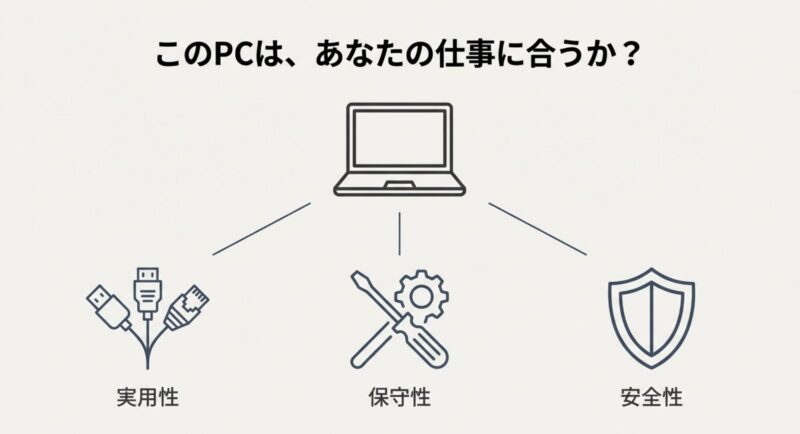 特に、vPro対応の有無、画面の明るさ、メモリ初期容量あたりは、後から取り返しがつきにくいポイントです。