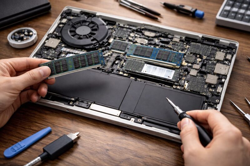 底面を開けると、メモリやSSD、バッテリーにアクセスできる個体が多く、長期運用の味方になります。