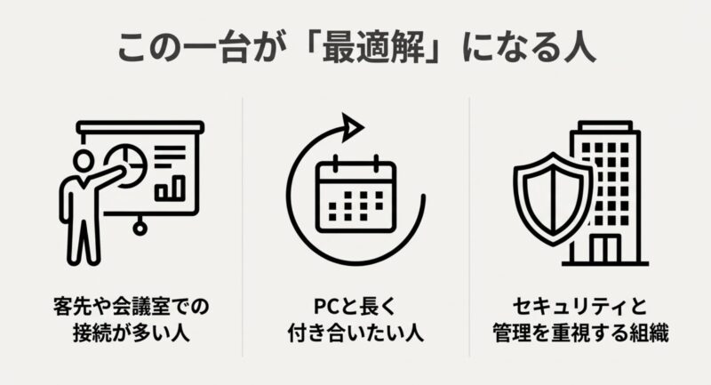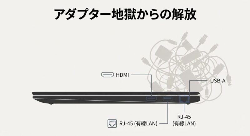 • 客先や会議室での接続が多い人(HDMI・有線LANが効く)
