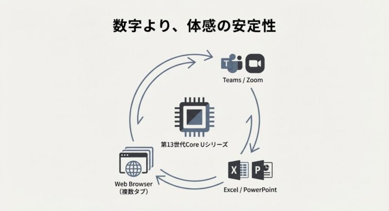 Uシリーズは省電力枠ですが、ハイブリッド構成(Pコア/Eコア)の恩恵で、Teams会議+資料作成+ブラウザ多タブみたいな「同時進行」に強いです。