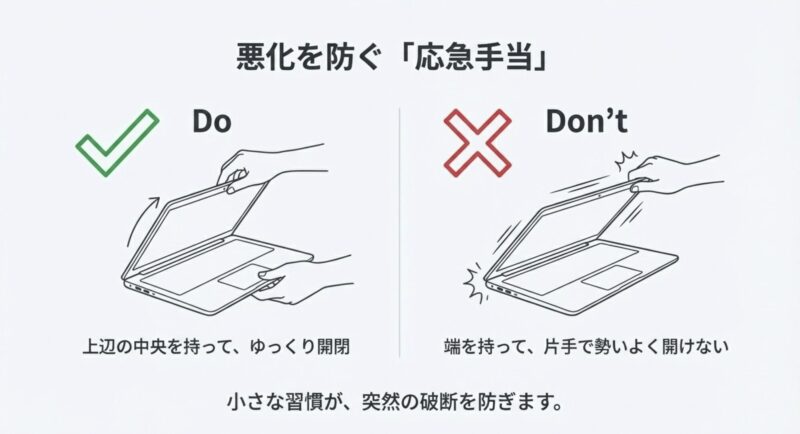 ヒンジ周りを触って痛いくらい尖っている、金属が露出している、開閉すると画面が「ぐにゃっ」と動く場合は、無理に使い続けない方が安全です。