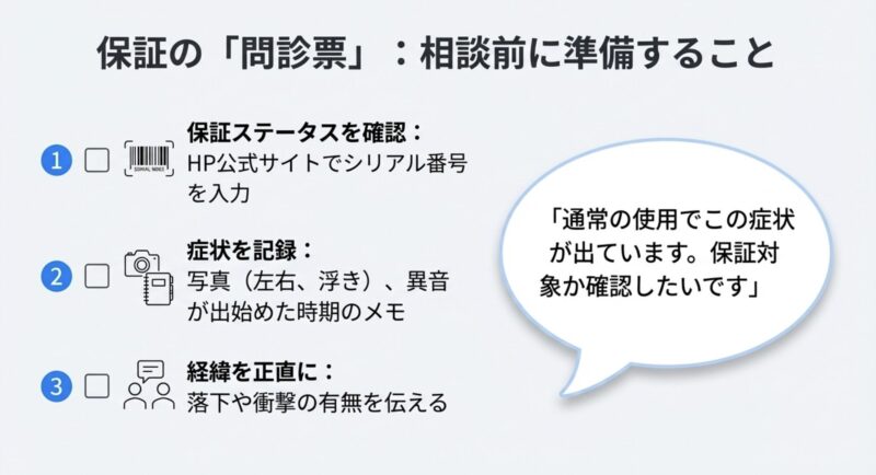 あと地味に効くのが、「いつから重くなったか」「落下や圧迫があったか」をメモしておくこと。