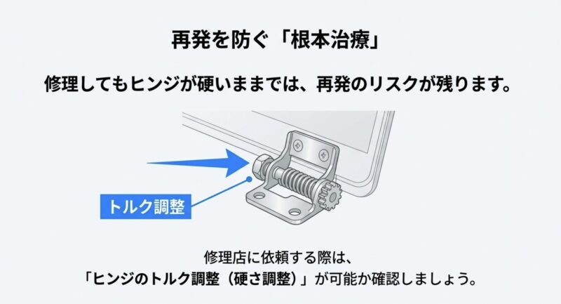 ヒンジ固定部が弱いのに、ヒンジが硬いままだと、同じことが繰り返されやすい。