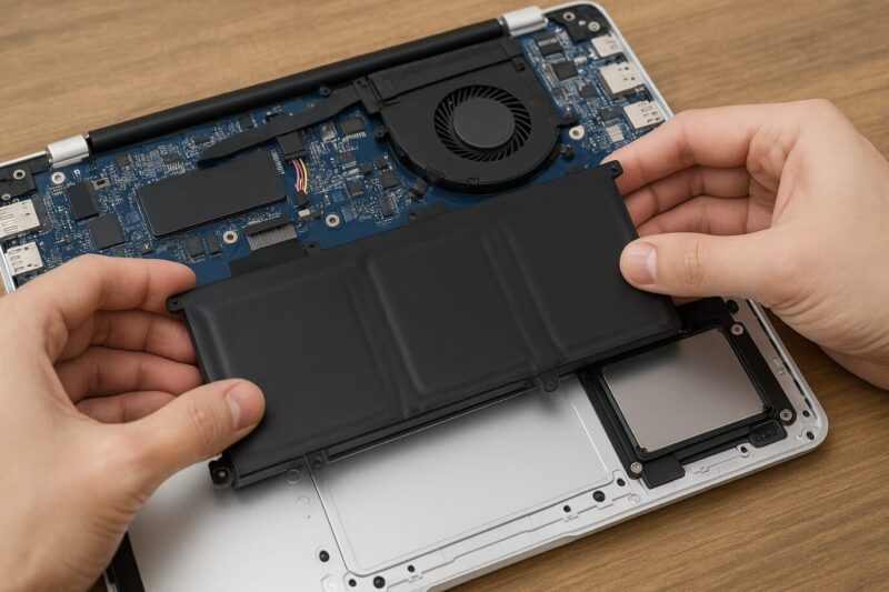 技術的には、底面を開けて、バッテリーを固定している数本のネジを外し、マザーボードと繋がっているコネクタを抜けば交換可能です。