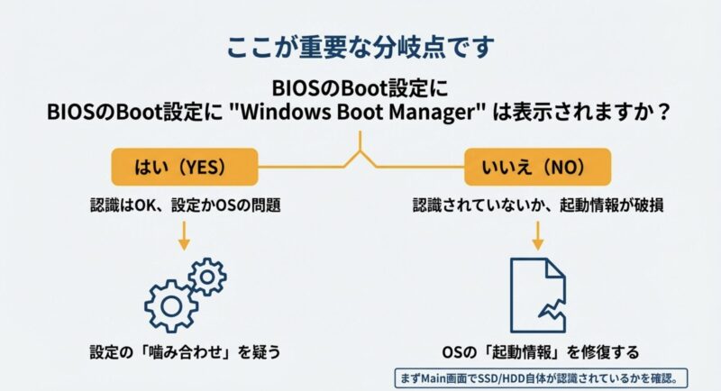 - SSD/HDDは見えるがWindows Boot Managerが出ない:設定不整合かブート領域破損の可能性