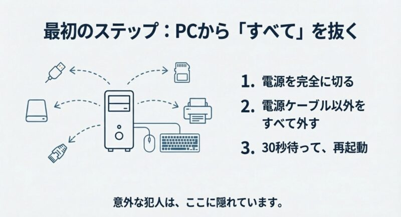 これも結局は“起動順のズレ”であることが多いので、次の「周辺機器外し」「Boot順の確認」が効きやすいです。