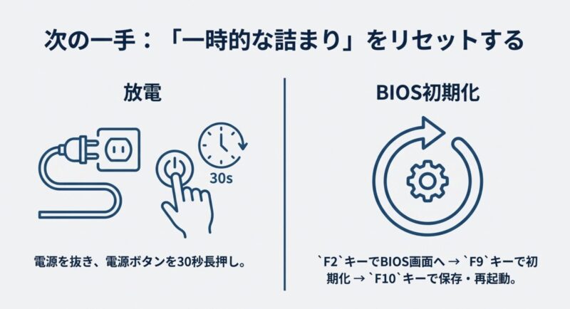 SSD/HDDがBIOSに出ない場合、私はまず放電をもう一回(手順を丁寧に)やって、それでもダメなら“物理寄り”を疑います。