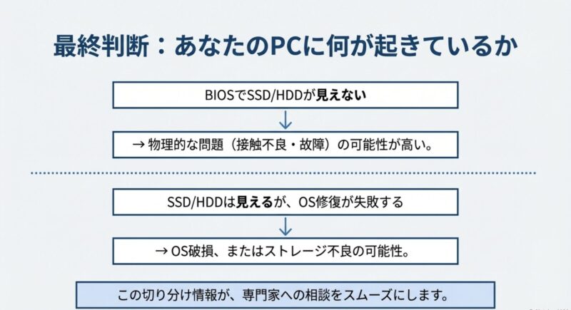 一方でSSD/HDDが表示されているのにWindowsが上がらないなら「起動順・設定不整合・ブート領域(BCD/MBR)の破損」の可能性が上がる、という感じです。