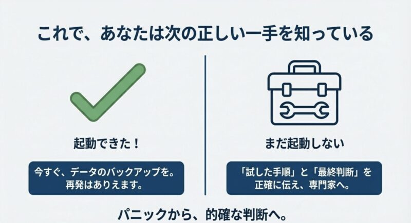 大事なデータがあるなら、焦って繰り返し操作する前に、データ退避や専門家への相談も検討してください。