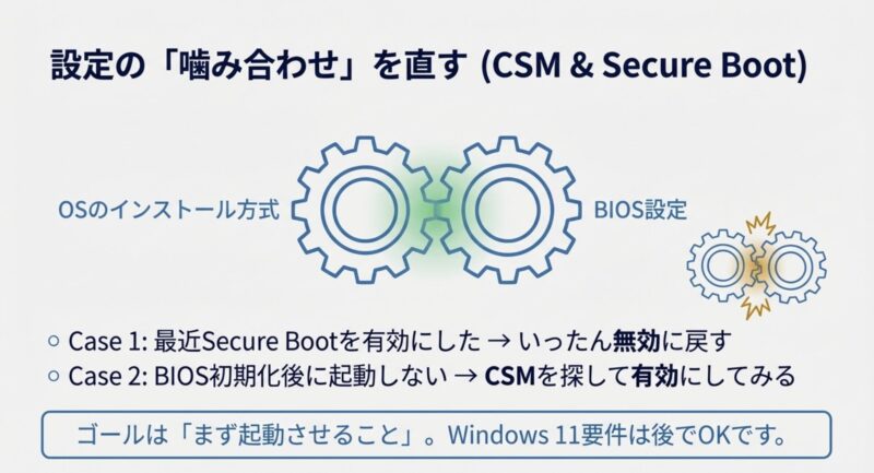 - Secure BootやCSMの設定がOSの入れ方とズレている