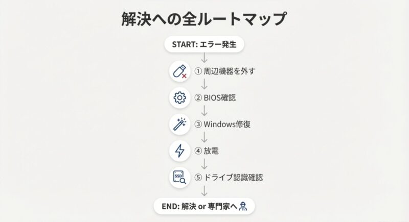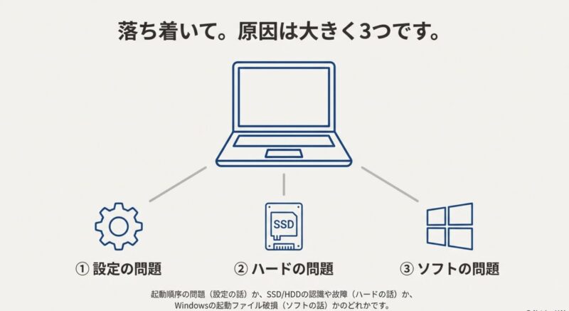 ざっくり言うと、起動順序の問題(設定の話)か、SSD/HDDの認識や故障(ハードの話)か、Windowsの起動ファイル破損(ソフトの話)かのどれかに寄っていきます。