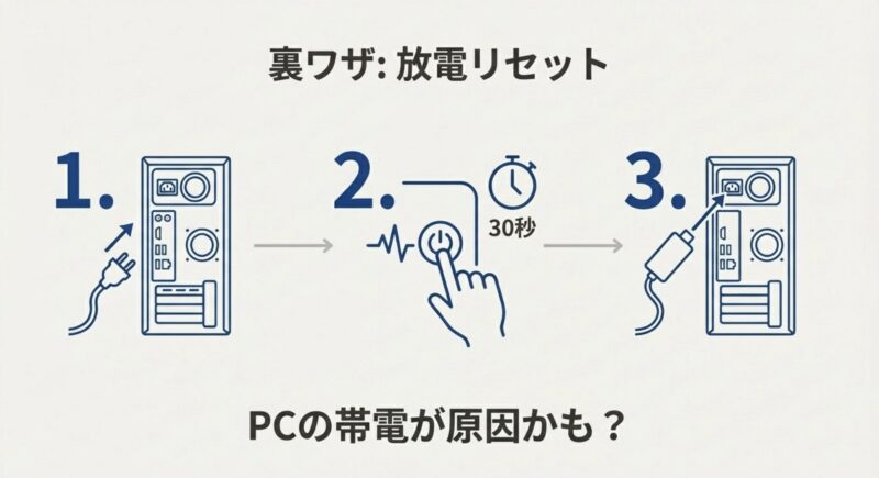 PCって、電源を切っても一部の回路に電気が残ることがあって、それが原因で復帰がうまくいかないケースがあります。