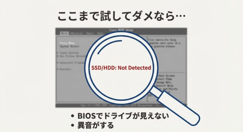 逆に、BIOS上にSSD/HDDがまったく出てこない場合は、接続不良や故障の疑いが一気に濃くなります。