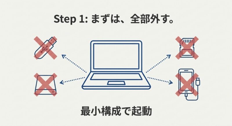たとえばUSBメモリや外付けHDDを挿したまま起動すると、PCがそっちを“起動デバイス”として見に行ってしまうことがあるんですよね。