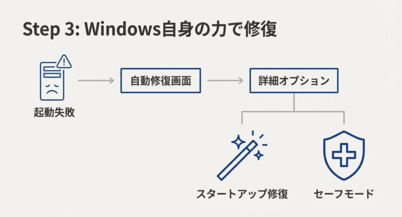 セーフモードが難しい、またはチェックディスクでも改善しないなら、Windowsのスタートアップ修復を試します。