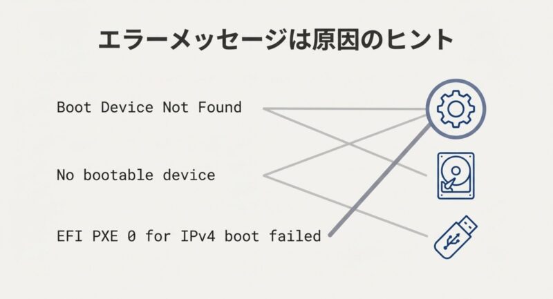 外部デバイス、ブート順序、起動方式(UEFI/Legacy)のズレで出ることがあるので、落ち着いて上から潰すのが近道です。