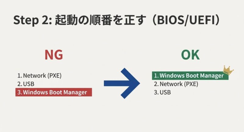 この場合はブート順序(起動の優先順位)や、Windows Boot Managerが上に来ているかを整えるだけで復旧することがあります。
