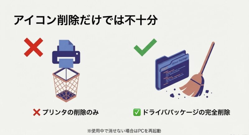 ドライバの入れ直しで一番大事なのは、単にプリンタのアイコンを消すだけで終わらせないことです。