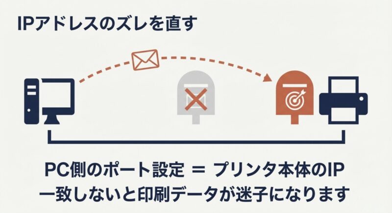 特にDHCP環境では、プリンタ本体のアドレスが変わったのに、PC側のポート設定だけ古いまま残ることがあります。