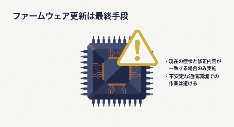 ファームウェア更新は有効な手段ですが、実施前に現行バージョンと変更点を確認してください。