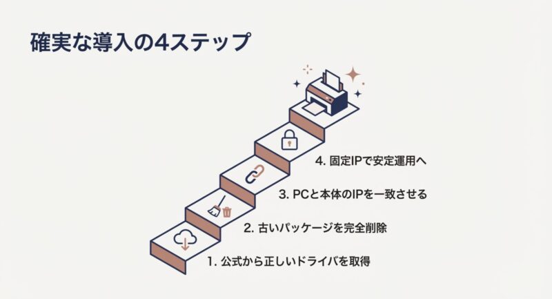 迷ったら、ドライバ選定 → 接続方式確認 → ポートとIP確認 → 完全削除後の再導入、の順で進めると大きく外しにくいです。