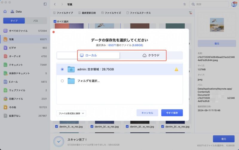 復元が完了すると、指定した保存先にファイルが保存されます。