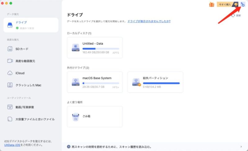 ソフトウェアを起動すると、メイン画面にMacの内蔵ドライブや接続されている外付けデバイスが表示されます。
