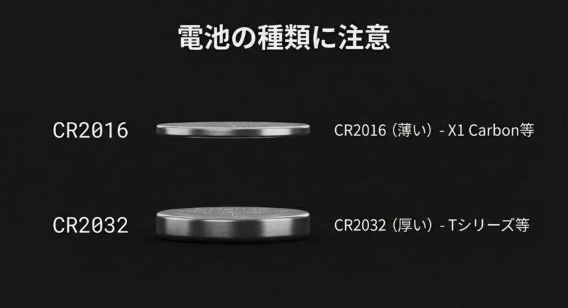 特に薄型モデル(X1 Carbon系や一部のXシリーズ)はCR2016採用が多く、厚みが合わないと裏蓋が閉まらないことがあります。
