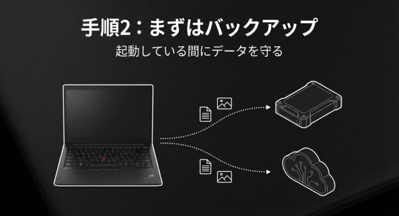 - 起動できるならデータのバックアップを先に取る
