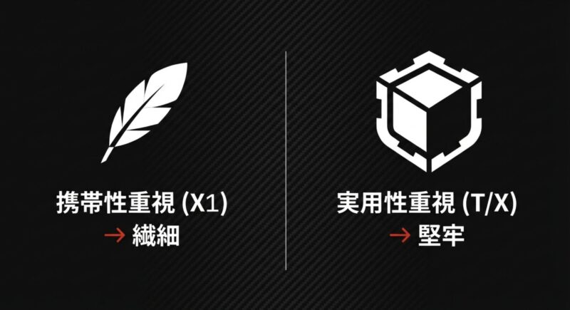 ざっくり言うと、X1は薄型軽量で持ち運び前提、Tは法人の現場で長く使われる前提。