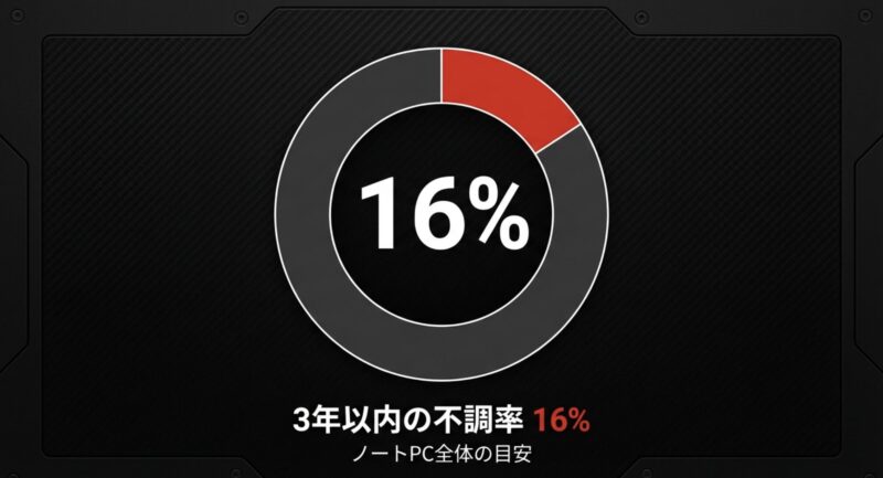 その代理指標として有名なのが、ノートPC全体で3年以内に壊れた、または本来の性能で動かなくなった割合が16%という整理です。
